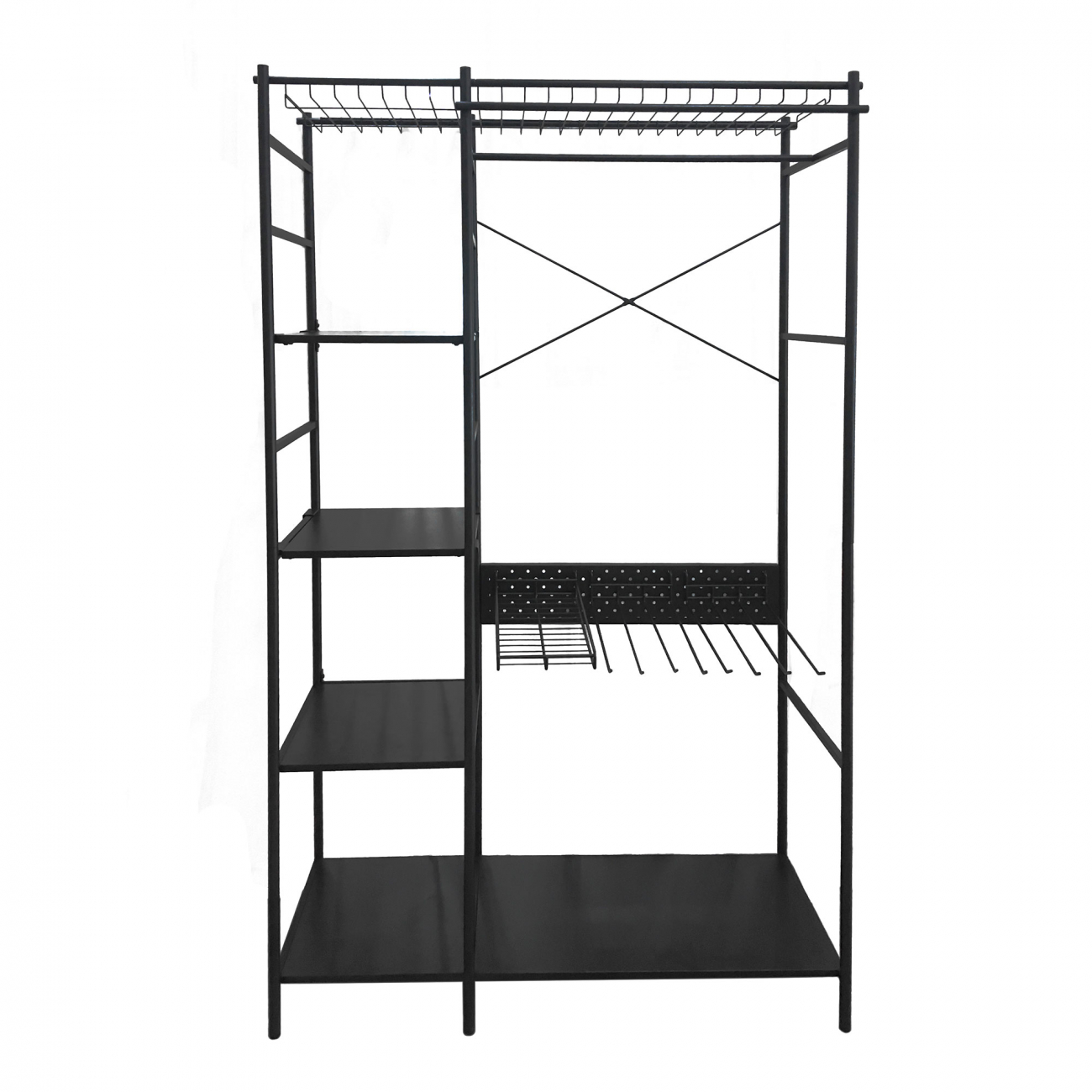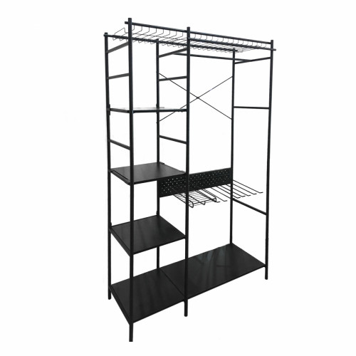 Открытый шкаф с металлической структурой и меламиновыми полками.